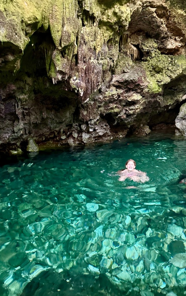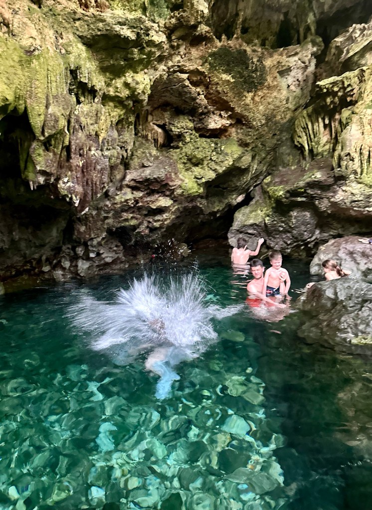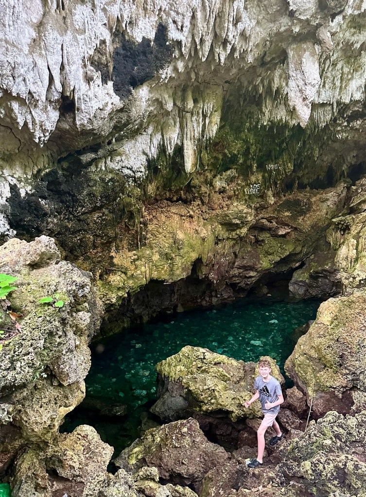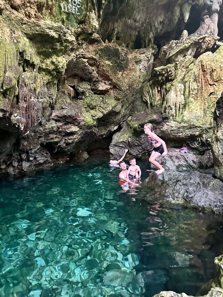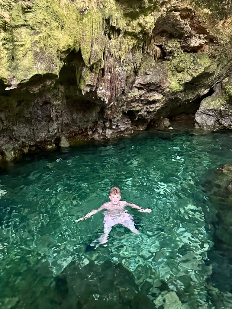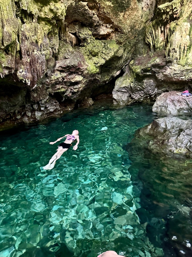 We’ve seen pictures and have been dreaming of swimming in cave pools. As we were looking for the path to one of these hidden beauties near our resort, a concerned local asked where we were going. After a few tries, he understood. Then he said: “Not recommended for tourists, ma’am. No one cleans there. It’s isolated. Be careful!” A warning like that made it feel like a giant, life-threatening adventure. In reality, it was a 5-10 minute walk down a path in the woods/jungle. There was some litter en route, but the pool was pristine.