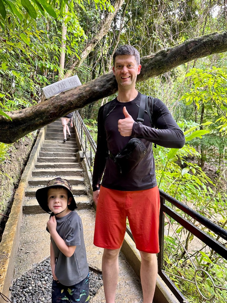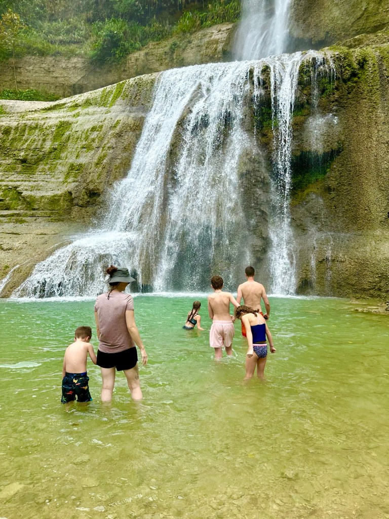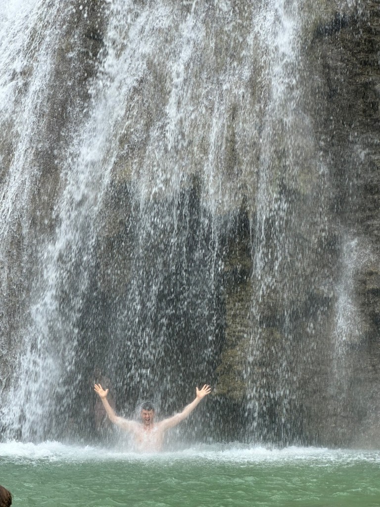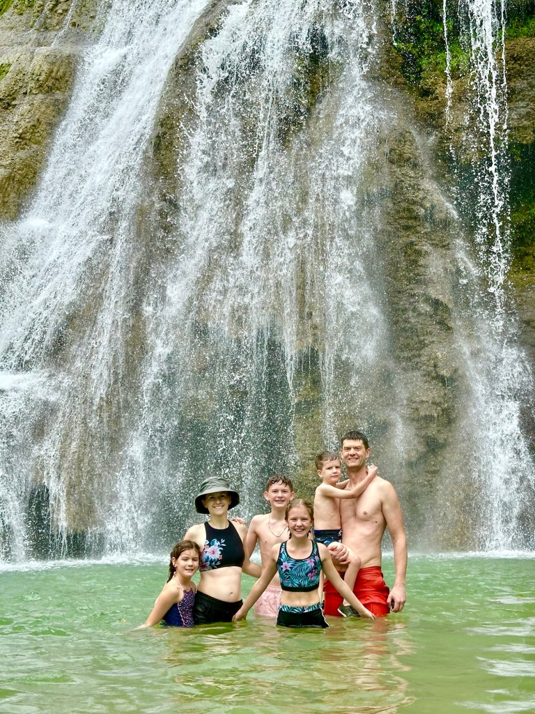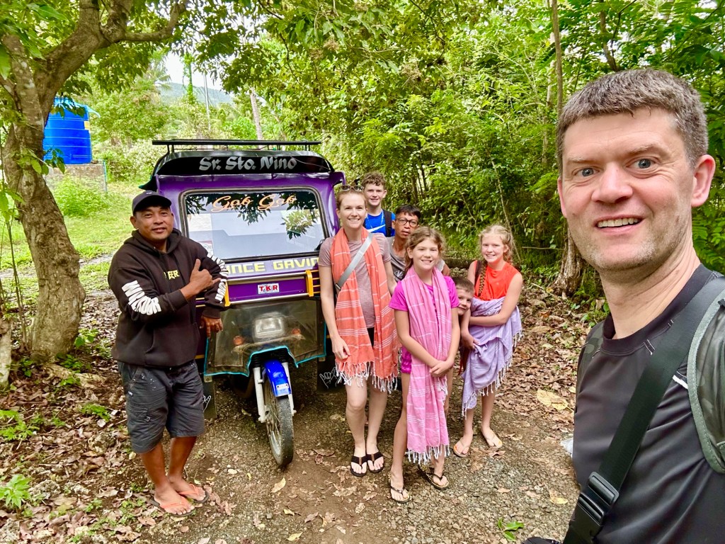 At 60m, these are the tallest waterfalls on Bohol. They were spectacular! We got to swim in the pools at the bottom, which were 6 feet deep at the deepest part, and all six of us even got to go through the falls to see them from behind! Talk about a high pressure shower! The journey to the falls was almost as fun… We took a one hour “tricycle” ride. These tricycles are actually motorbikes with covered passenger compartments welded on. (See the picture). This one was probably as old as me. We had to stop early in the trip to inflate the front tire. On some steeper sections of the climb, the driver’s assistant hopped out and pushed! Pouring rain made the experience even more memorable. The last kilometre was closed to anything with more than two wheels, including tricycles like ours. This kilometre was a very steep walk down to get to the bottom of the falls. Inspired by events earlier in the day, Daniel offered to help his mom back up by giving her a little push from behind. She politely declined and made it back up on her own power 🙂