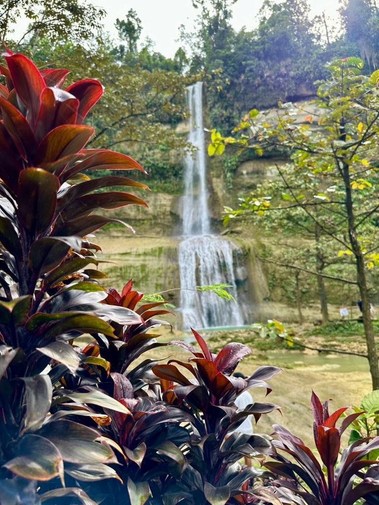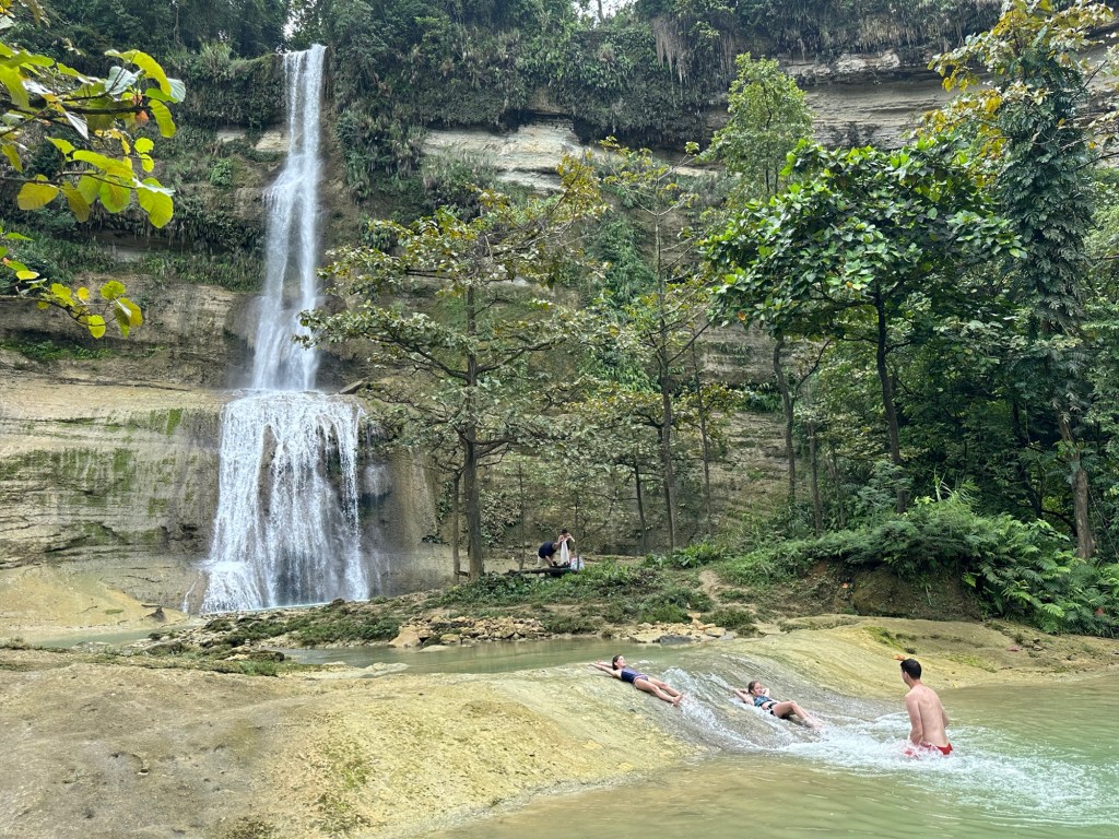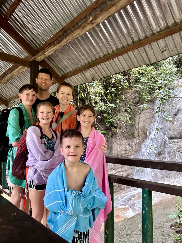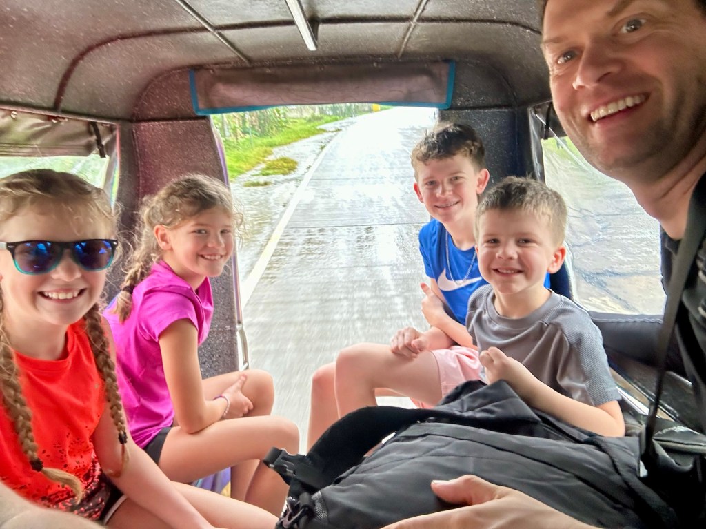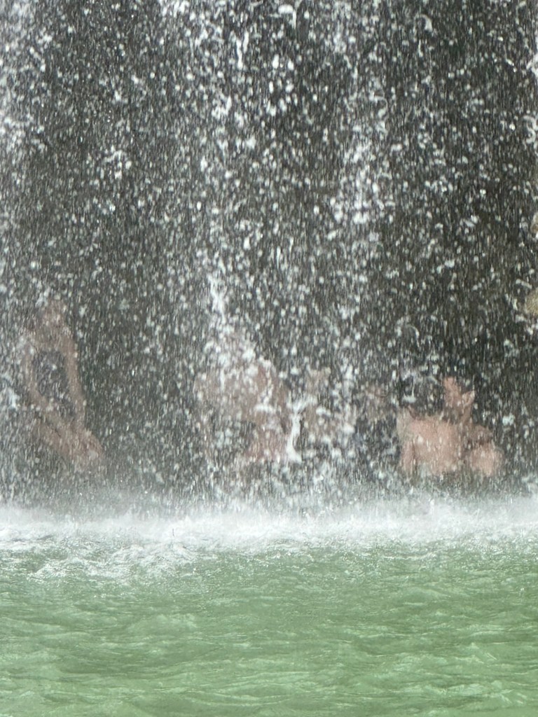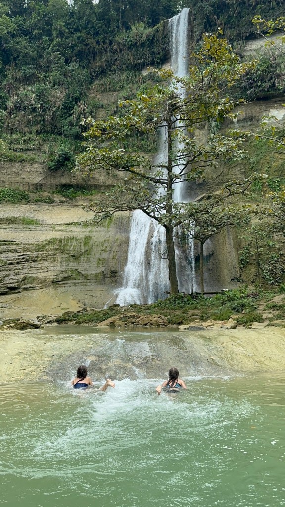 At 60m, these are the tallest waterfalls on Bohol. They were spectacular! We got to swim in the pools at the bottom, which were 6 feet deep at the deepest part, and all six of us even got to go through the falls to see them from behind! Talk about a high pressure shower! The journey to the falls was almost as fun… We took a one hour “tricycle” ride. These tricycles are actually motorbikes with covered passenger compartments welded on. (See the picture). This one was probably as old as me. We had to stop early in the trip to inflate the front tire. On some steeper sections of the climb, the driver’s assistant hopped out and pushed! Pouring rain made the experience even more memorable. The last kilometre was closed to anything with more than two wheels, including tricycles like ours. This kilometre was a very steep walk down to get to the bottom of the falls. Inspired by events earlier in the day, Daniel offered to help his mom back up by giving her a little push from behind. She politely declined and made it back up on her own power 🙂