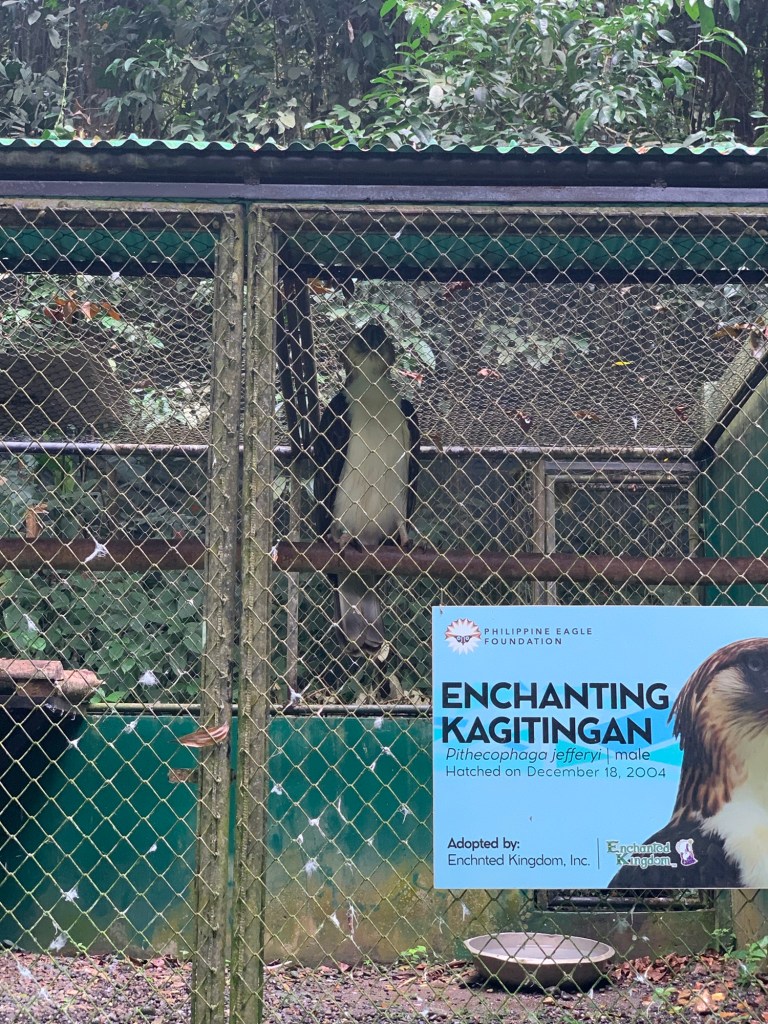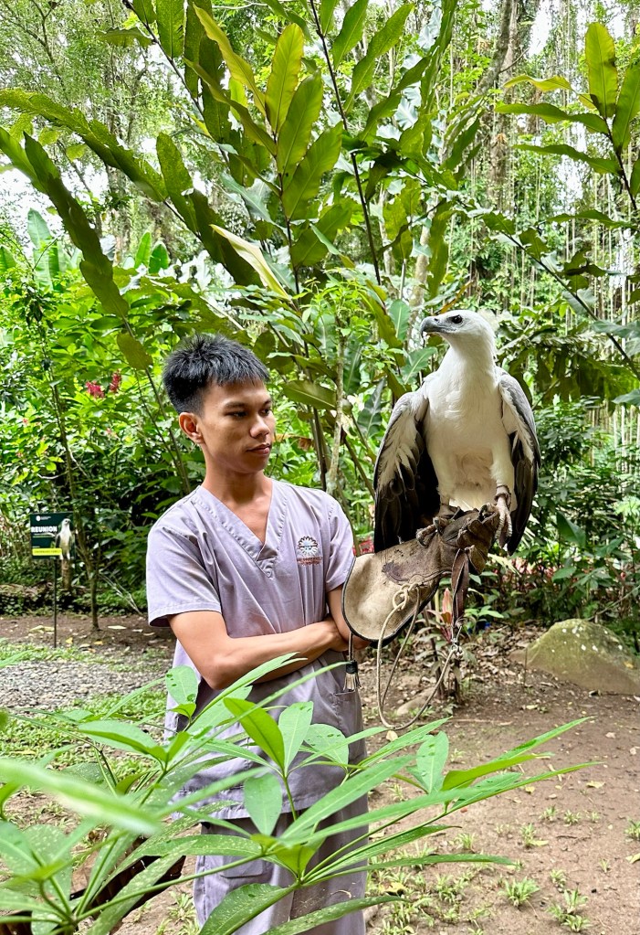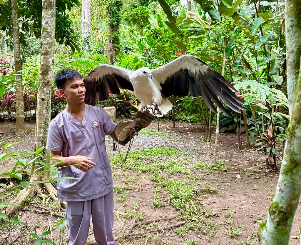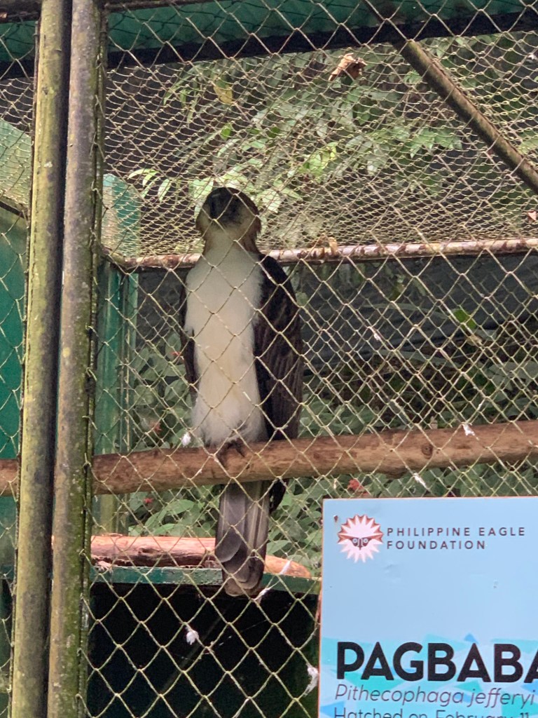 With a 7 foot wingspan, the Philippine Eagle is the biggest eagle in the world. We have been looking forward to seeing this majestic creature for months. Interestingly, we learned that female Philippine Eagles are larger than male eagles. They say males are smaller so they can be more agile hunters in their forest home. We also learned that Philippine Eagles are lifetime monogamous: even if their partner dies, they will not find another mate. They only lay one egg at a time, and that only every 2 years. Unfortunately, to protect the Philippine Eagles from bird flu, their enclosures were far from the foot path. We could see them well in person but without a proper telephoto lens, the pictures didn’t turn out that great (the pictures behind chain link fence are of the Philippine Eagles, the up close shots are of other birds). There were many other interesting birds and LOTS of great trees and plants. Sanctuary is a fitting name name for this place.