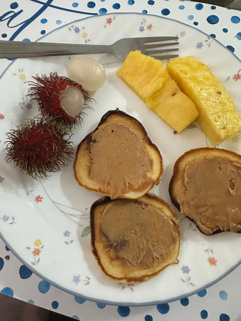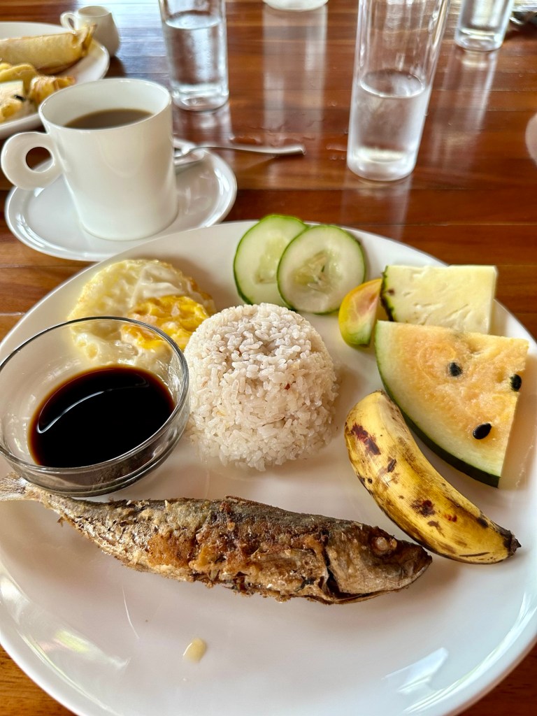 A typical breakfast here is rice, egg, fish, and fruit. Quite filling!