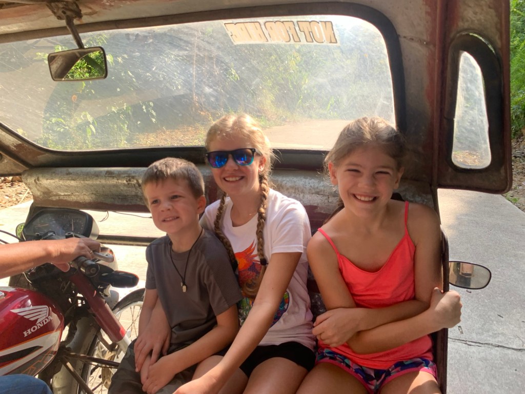 After the cave and bangka ride back to town, we played on a beach with great waves for a couple of hours. Then Leisel found another tuktuk to take us back to the resort. This one was smaller and lacked some power. The driver warned us we might have to push on a couple of hills. Sure enough, I hopped out twice to give a boost! Some would say that my weight getting out of the trike helped more than anything, but I know the truth 🙂 All in all, this trip was another smashing success!!
