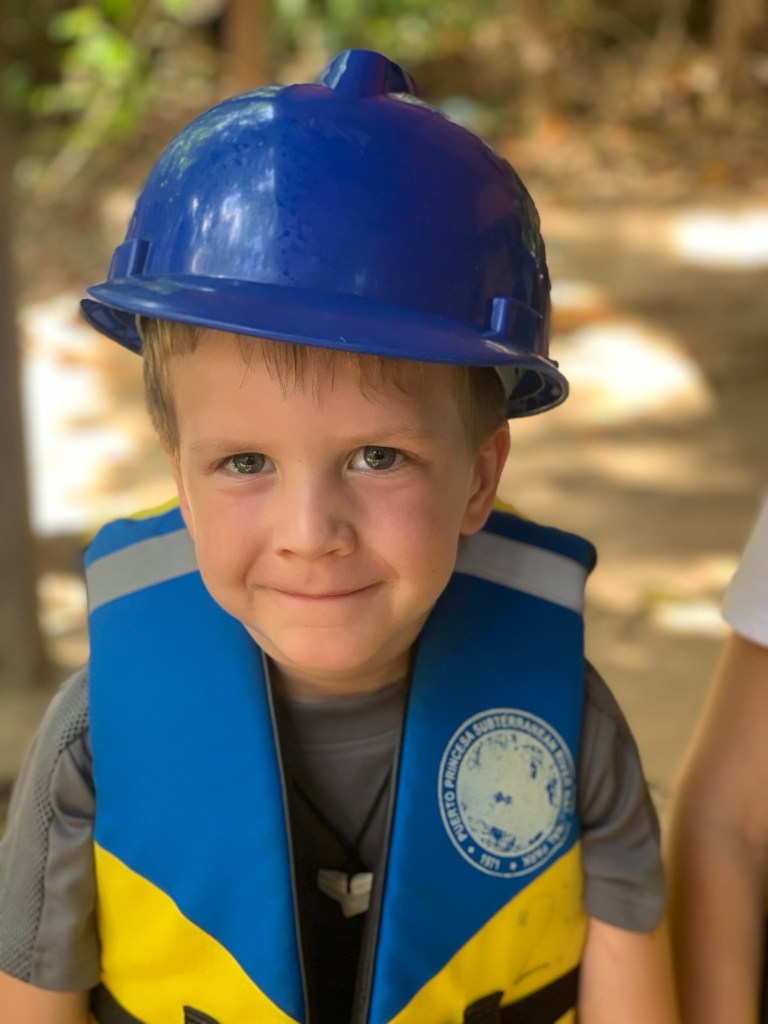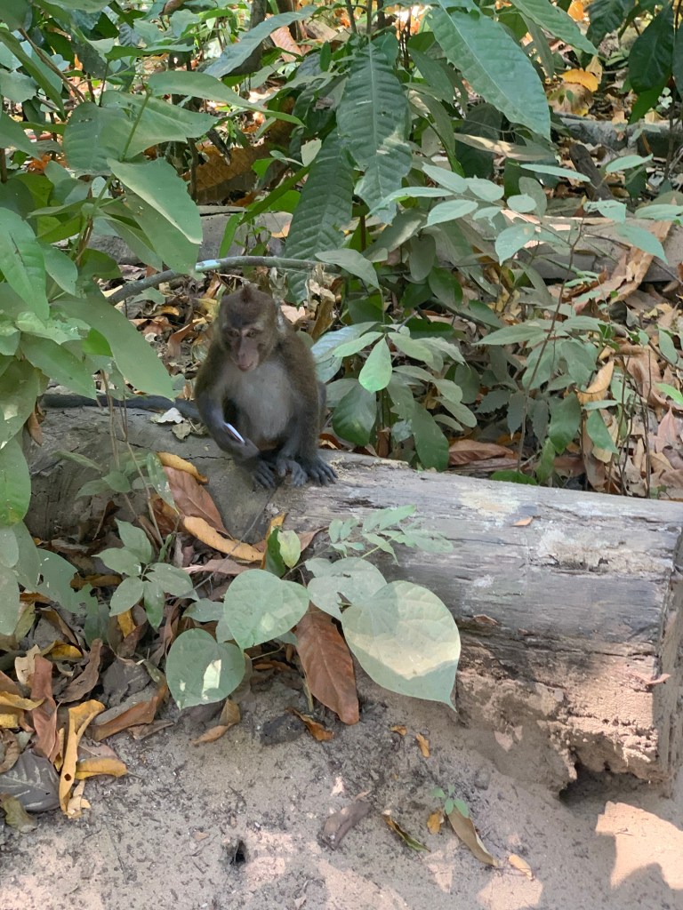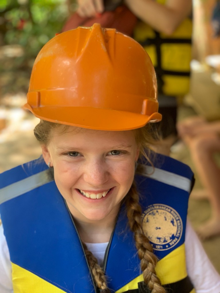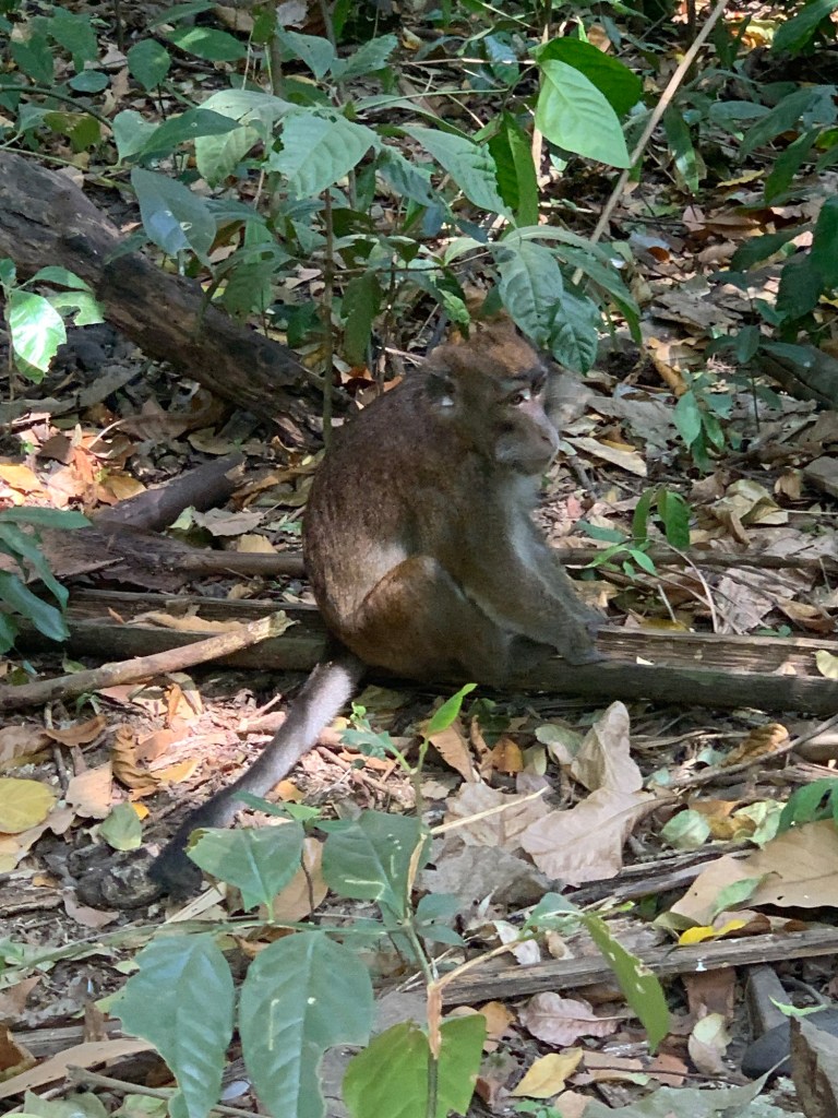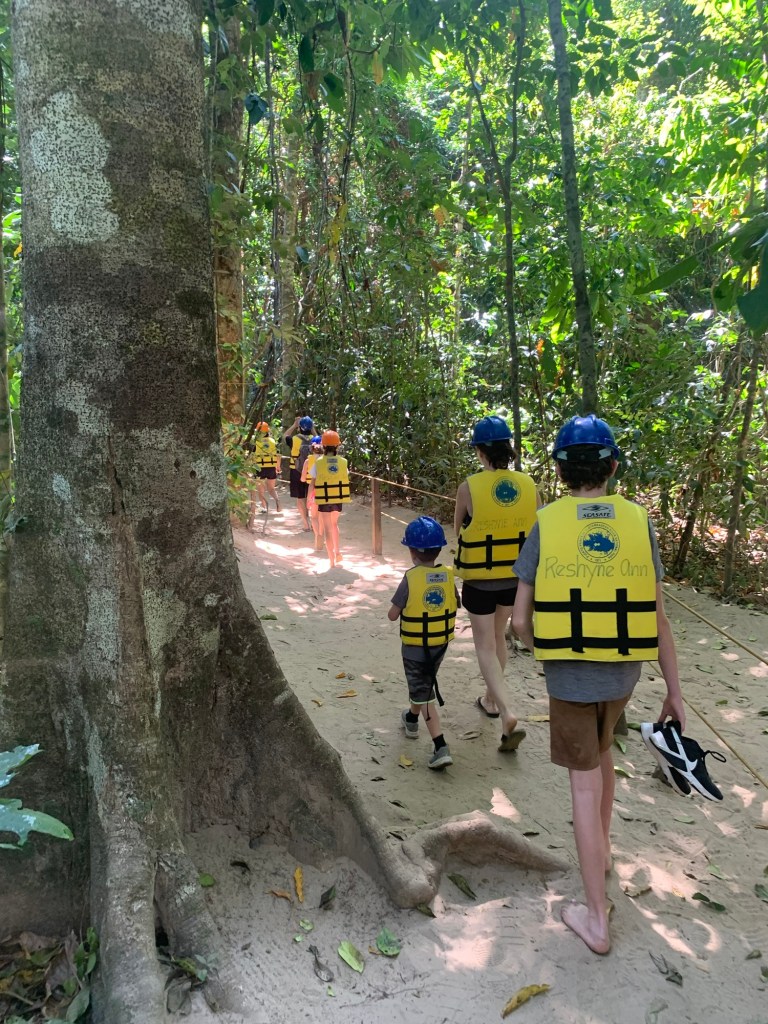 After the tuktuk ride from our resort to Sebang, we got on a bangka (boat) to access the part of the park that houses the subterranean river (there is no road access). We’ve seen lots of these bangkas and we enjoyed the chance to ride one. They have LOUD engines, but feel very stable. After the bangka ride, we got helmets and took a short jungle hike past some monkeys to the mouth of the cave/river. Here we got onto a much smaller, guide-with-a-paddle-powered, bangka for the tour of the river itself.